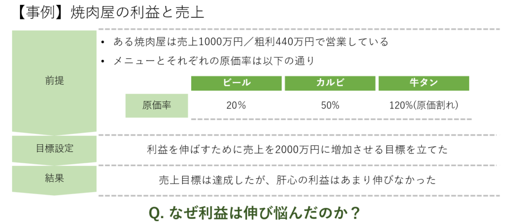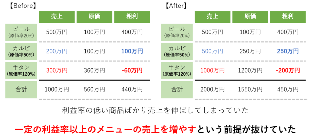 この事例では、焼肉屋が売上を倍にするために、全体の売上目標だけに注目し、商品の利益率を考慮しませんでした。その結果、利益率の低い商品(牛タン)の売上が大幅に増加し、粗利益が十分に確保できなかったのです。一定の利益率以上のメニューの売上を増やすという前提が抜けていたため、売上が伸びても利益が伸び悩む結果となったのです。