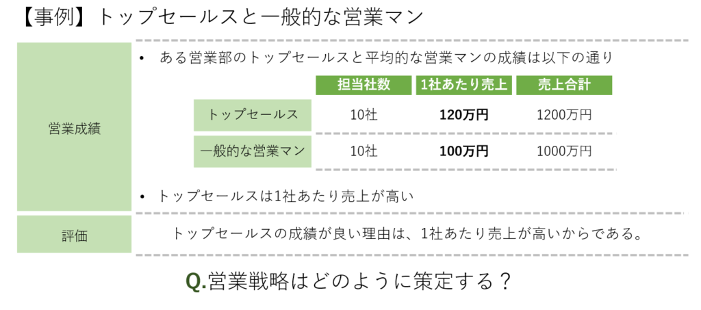 ある営業部のトップセールスと平均的な営業マンの成績は以下の通りです。トップセールスは1社あたり売上が高いため、成績が良いと評価されました。では、営業戦略はどのように策定するべきでしょうか?