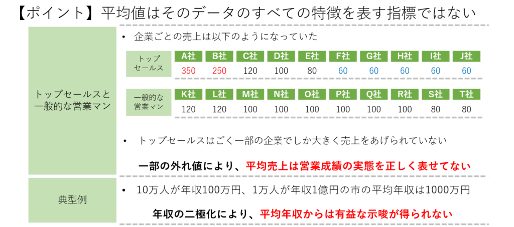 - 平均値の罠: データのばらつきを考慮せず、平均値だけで判断すること。