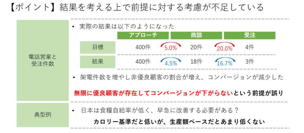 この事例では、前年のCVRを基にアプローチ件数を増やすことで売上目標を達成できると考えました。しかし、実際には見込みの低い顧客にも多くアプローチすることになり、コンバージョン率が低下しました。また、営業担当者にかかる負荷が増大し、顧客対応の質が低下したことも原因の一つです。このように、前提条件を現実に即していないまま計画を立てると、誤った結論に至ることになります。