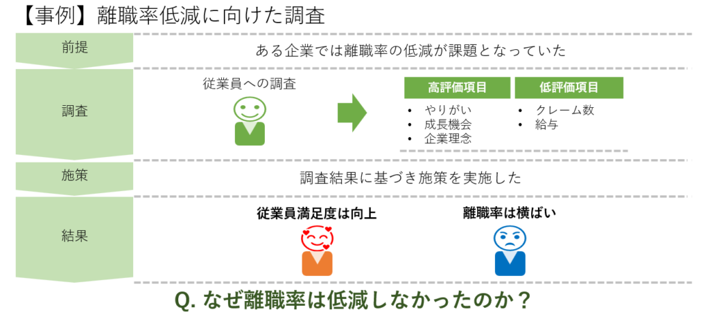 この事例では、調査対象を現在の従業員のみに限定していたため、離職者の意見を反映できませんでした。実際には、離職者が低く評価する「人間関係」は依然として改善されておらず、離職率が低減しなかったのです。離職者を調査対象とすべきところを、従業員のみを調査対象としていたため、得られたデータが全体を正確に反映していませんでした。
