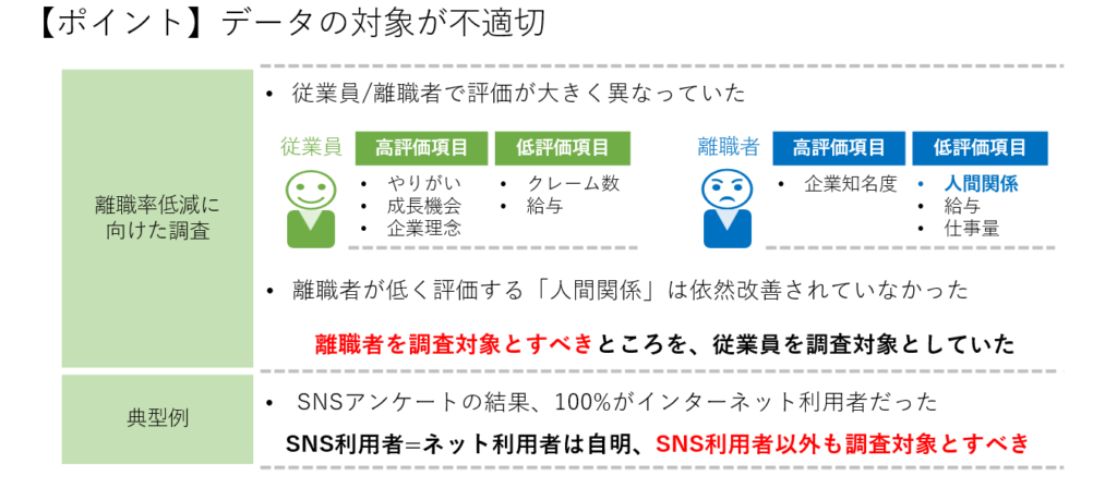 - 対象の偏り: データの調査対象が調査目的に適さない場合。