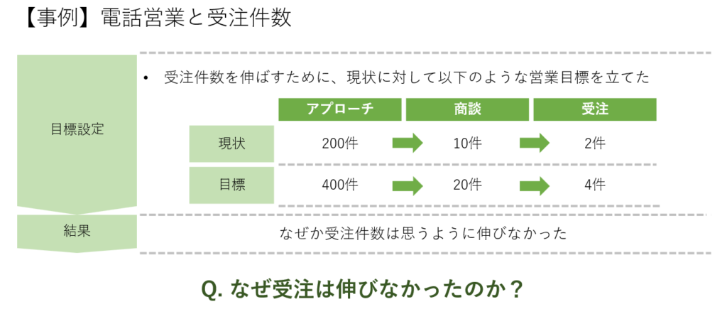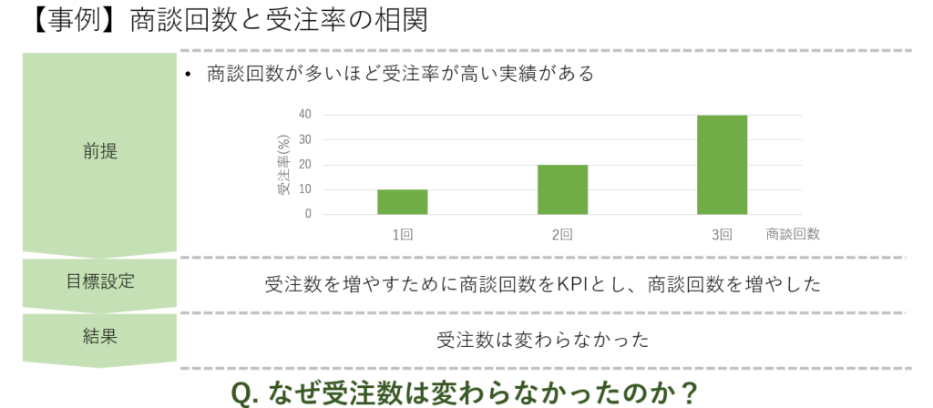 ある企業では、商談回数が多いほど受注率が高い実績がありました。そこで、受注数を増やすために商談回数をKPIとし、商談回数を増やす目標を設定しました。しかし、実際には受注数は変わらず、商談回数だけが増加しました。では、なぜ受注数が変わらなかったのでしょうか?