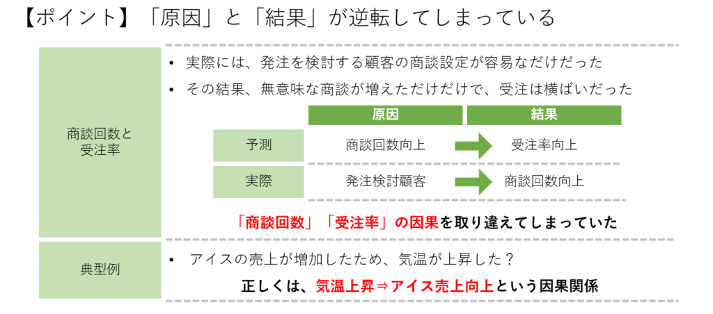 この事例では、商談回数が多いことが受注率の向上を引き起こしていると誤解されました。しかし、実際には受注を検討する顧客が商談設定を容易にする傾向があり、その結果として商談回数が増えていたのです。つまり、商談回数が多いことが原因ではなく、受注を検討する顧客が多いことが商談回数を増やす結果となっていたのです。