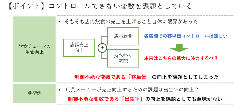 この事例では、店舗内飲食の売上を上げること自体に限界があったにもかかわらず、各店舗での客単価向上という制御不能な変数に注目してしまいました。実際には、持ち帰りや宅配の売上拡大に注力すべきだったのです。制御不能な変数である「客単価の向上」を課題と設定してしまったため、店舗売上の改善が見られなかったのです。