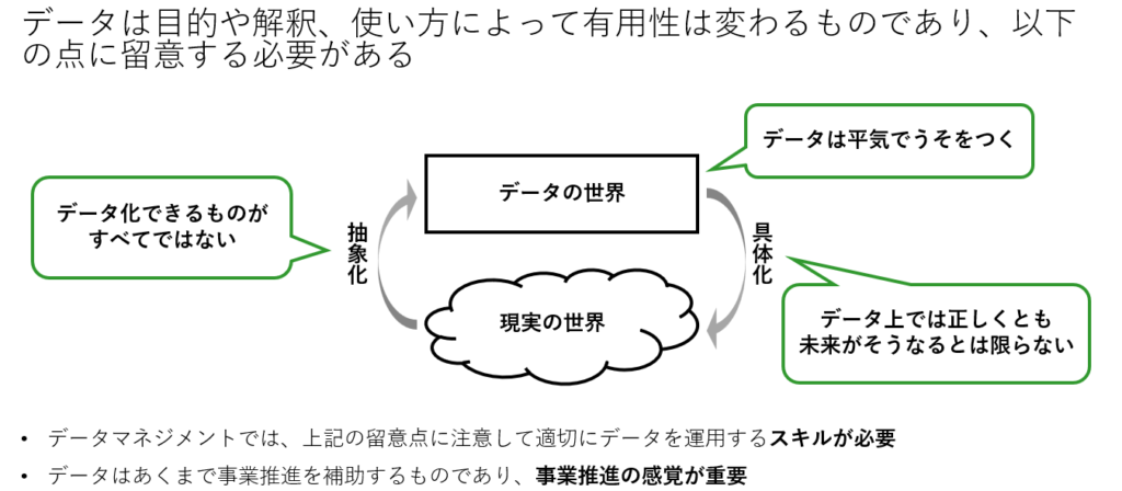 現代のビジネスにおいて、データは意思決定の重要な基盤です。しかし、データは万能ではなく、その解釈や使い方を誤ると大きな過ちにつながることがあります。データの有用性は目的や解釈、使い方によって変わり、データは平気でうそをつくこともあります。データ上で正しくても、未来がそうなるとは限りません。また、データ化できるものがすべてではないため、データマネジメントには適切なスキルが必要です。