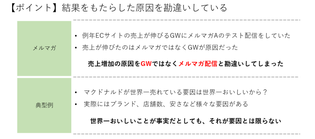 - 原因の勘違い: ある結果に対する原因を誤認識すること。