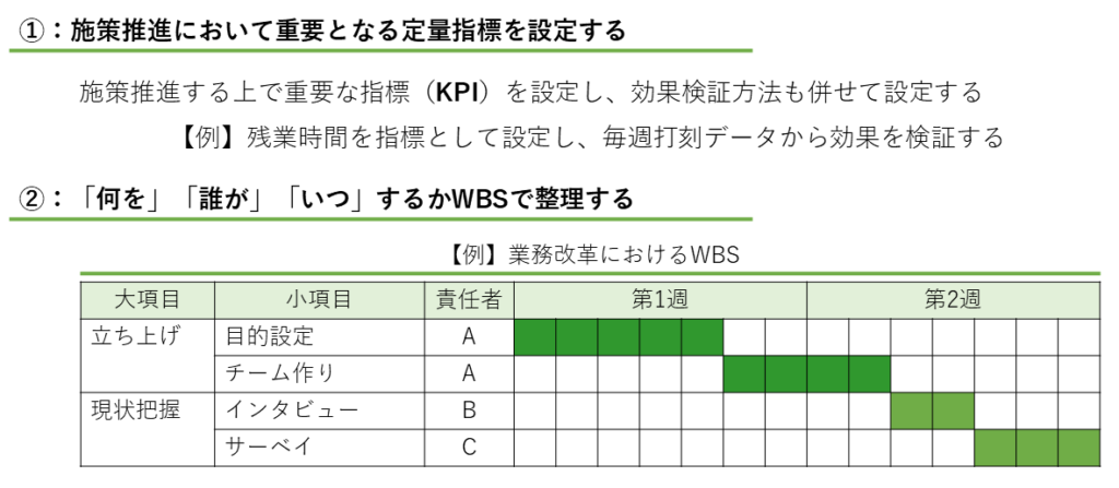 - KPI(Key Performance Indicators)の設定: 施策の進捗と成果を測定するための定量的な指標を設定します。例えば、残業時間の削減や、顧客満足度の向上などが考えられます。