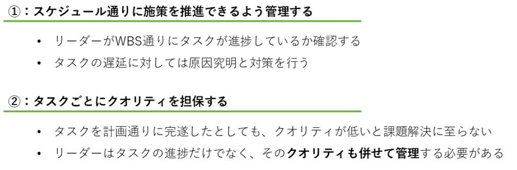 - タスクの品質保証: 各タスクが計画通りに完遂されても、クオリティが低いと課題解決に至りません。リーダーは進捗だけでなく、品質も管理します。