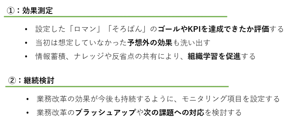 - 継続検討: 効果測定の結果を基に、業務改革の継続的なモニタリングと改善を行います。
