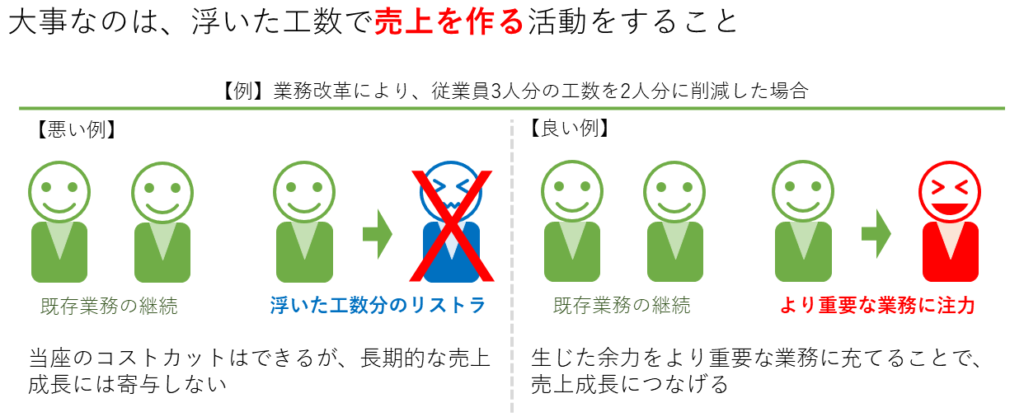 業務改革の目的は、人件費を減らすことではなく、浮いた工数で売上を作る活動をすることです。以下の図は、業務改革により従業員3人分の工数を2人分に削減した場合の良い例と悪い例を示しています。