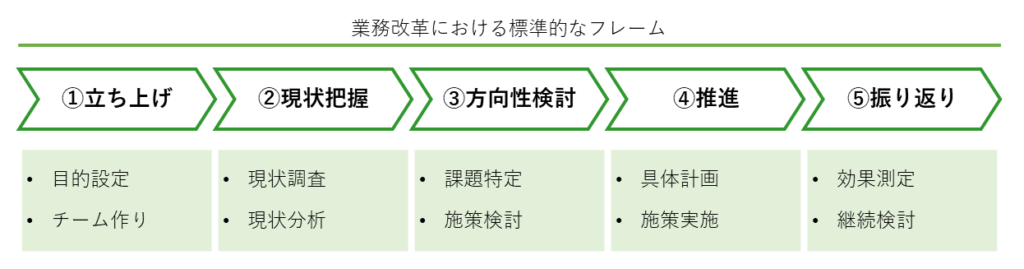 業務改革には、以下の5つの主要なプロセスがあります。これらのプロセスを順を追って実施することで、効果的な業務改革が可能となります。