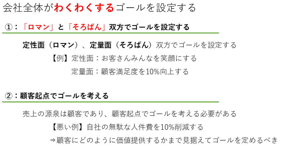 - ロマン: 企業の夢やビジョンを達成するための目標を設定します。例えば、「お客様全員を笑顔にする」や「従業員が幸せに働ける環境を作る」といった定性的な目標です。
