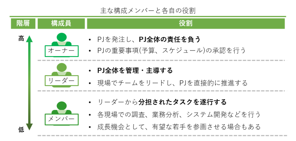 - リーダー: 現場でプロジェクトを主導する役割。チームメンバーをリードし、実行計画を進めます。