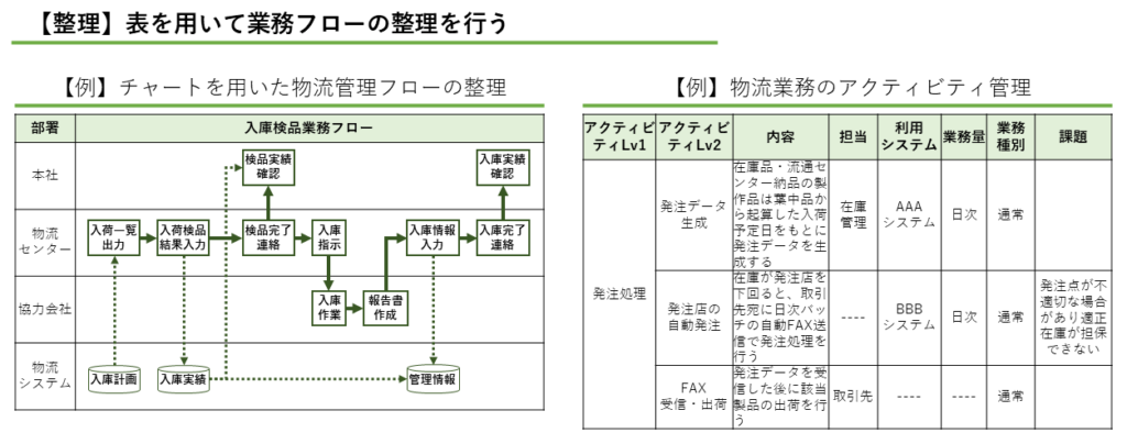 現状分析のフェーズでは、現状調査で収集したデータを基に、現行の業務プロセスを整理し、構造化します。これにより、業務フローの全体像を明確にし、具体的な課題を洗い出します。