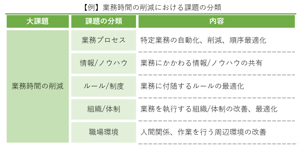 現状分析から得られたデータを基に、業務プロセスの中で改善が必要な課題を特定します。課題を明確にすることで、具体的な改善策を効果的に立案できます。大課題からブレイクダウンして、具体的な課題に落とし込みます。下記は業務削減が大課題の場合の例です。