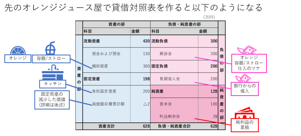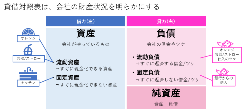 貸借対照表の内容は、具体的には、銀行口座に入っている預金額や会社が持つ現金、キッチンなどの物理的な資産、オレンジの在庫といった流動資産が反映されます。また、会社が抱える借金やその他の負債も表示されます。さらに、これらの資産と負債の差し引きにより、会社の純資産や株主資本の状況を確認することができます。このように、貸借対照表を通じて、会社の財務状態、流動性、資本構造などを総合的に理解することができます。