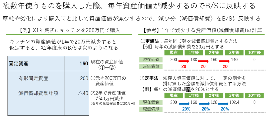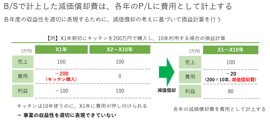 - キッチンなどの設備を200万円で購入(初月減価償却費2万円)