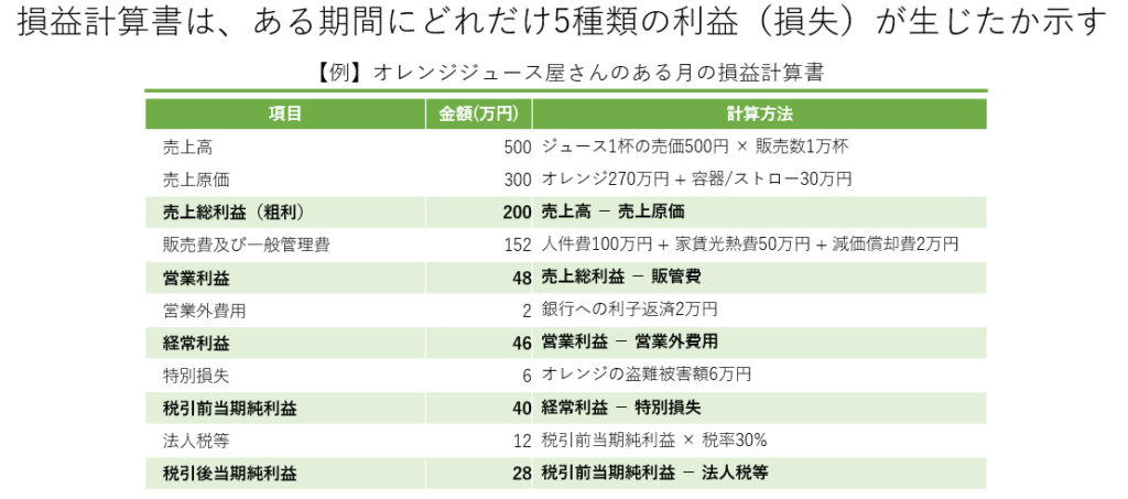 損益計算書は、一定期間にどれだけ5種類の利益(損失)が生じたかを示します。具体的には、売上高から始まり、売上原価、販管費、営業外収益・費用、特別損益を経て、税引後当期純利益に至るまでの各利益を示します。