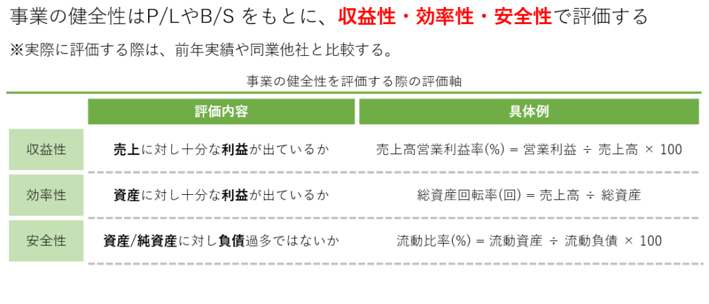 事業の健全性は、収益性、効率性、安全性の観点から評価されます。例えば、収益性は売上高営業利益率、効率性は総資産回転率、安全性は流動比率で評価します。