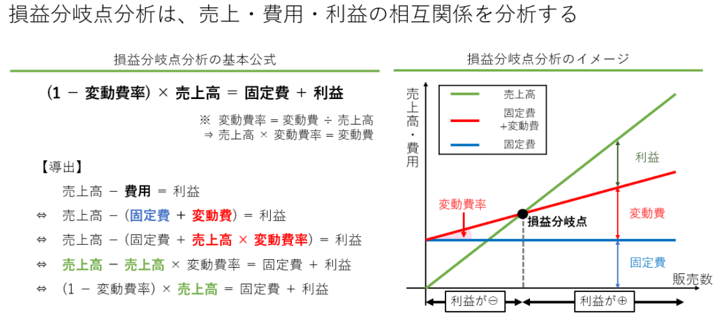 損益分岐点分析は、売上と費用の関係を分析し、利益がゼロになる売上高を求める方法です。損益分岐点を超えると利益が生じます。