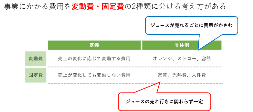 事業にかかる費用を変動費と固定費に分けることで、費用管理がしやすくなります。変動費は売上の変化に応じて変動し、固定費は売上が変化しても変動しません。